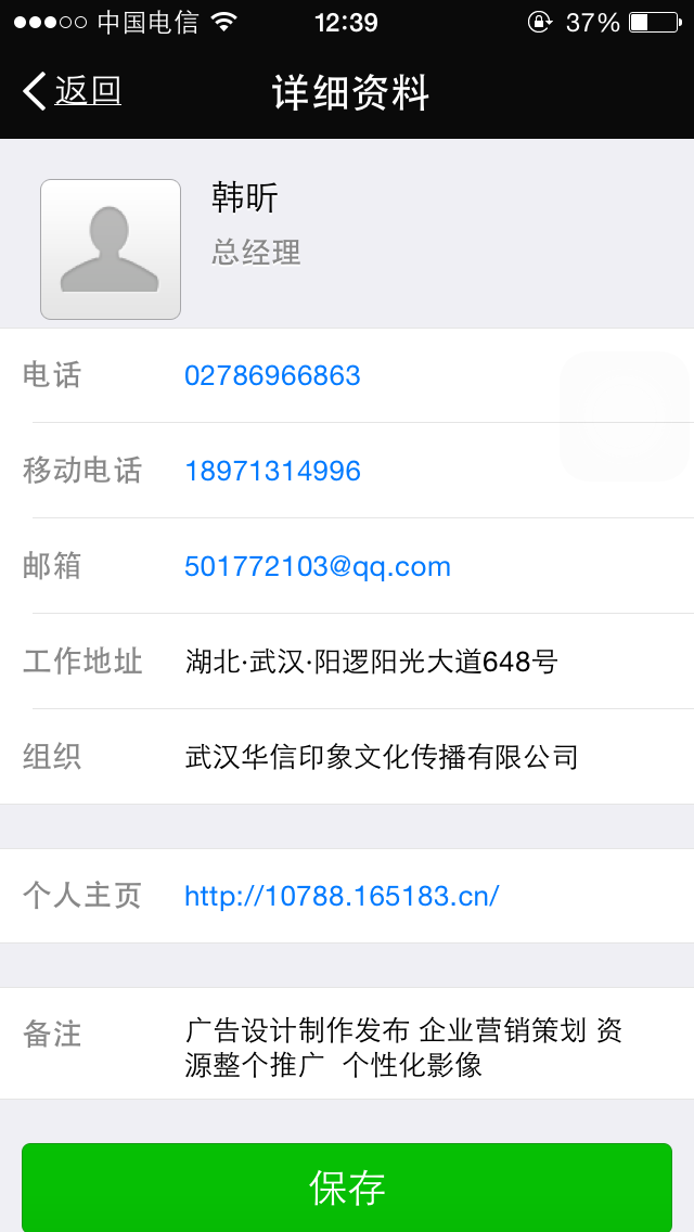 没错,直接就把传统名片的姓名、电话、地址等常用信息显示出来了,直接点击保存即可存到手机通讯录,简单吧?